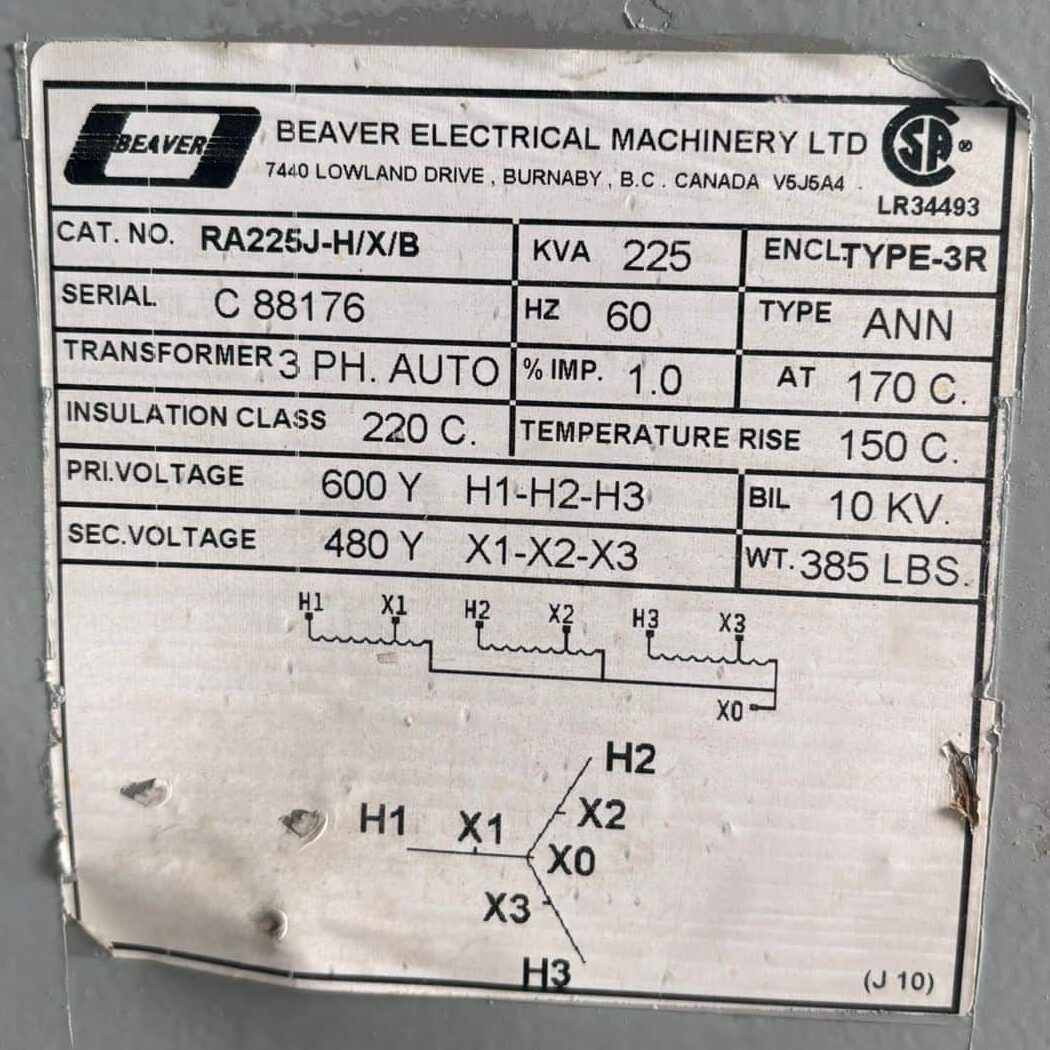 Beaver 225kVA – 600V to 480V Three Phase Transformer